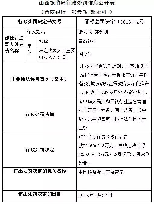 依據(jù)《中華人民共和國(guó)銀行業(yè)監(jiān)督管理法》第四十六條、四十八條;《中華人民共和國(guó)商業(yè)銀行法》第七十三條,山西監(jiān)管局對(duì)晉商銀行責(zé)令改正,罰款70.690513萬(wàn)元,沒(méi)收違法所得20.690513萬(wàn)元;對(duì)張?jiān)骑w、郭永剛警告。作出處罰決定的日期為2018年3月27日。