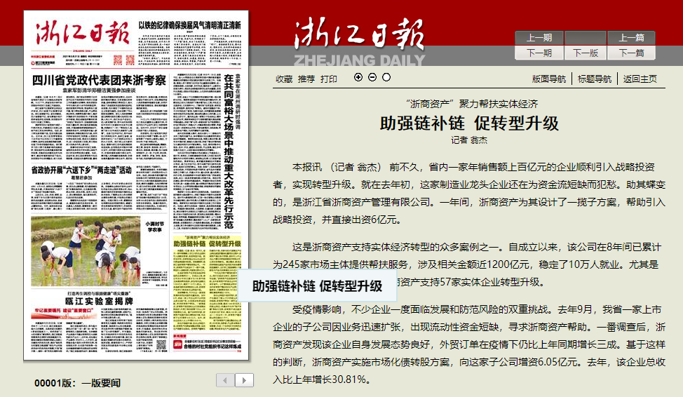這是浙商資產(chǎn)支持實體經(jīng)濟轉(zhuǎn)型的眾多案例之一。自成立以來,該公司在8年間已累計為245家市場主體提供幫扶服務,涉及相關(guān)金額近1200億元,穩(wěn)定了10萬人就業(yè)。尤其是新冠肺炎疫情發(fā)生以來,浙商資產(chǎn)支持57家實體企業(yè)轉(zhuǎn)型升級。