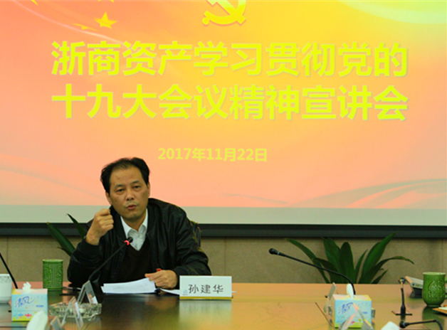 孫建華書記要求,要在十九大精神的指引下,推動(dòng)浙商資產(chǎn)加速發(fā)展。一要牢牢把握十九大對國有企業(yè)的有關(guān)論述,按照“培育一流企業(yè)”要求,更高標(biāo)準(zhǔn)、更高要求制定戰(zhàn)略規(guī)劃,堅(jiān)持勇立潮頭,盡快打造資產(chǎn)管理公司全國性品牌;二要對照金融領(lǐng)域作出的針對性部署,助力解決不平衡不充分的發(fā)展、助力省委提出的鳳凰計(jì)劃、助力集團(tuán)產(chǎn)業(yè)共融發(fā)展,把服務(wù)實(shí)體經(jīng)濟(jì)作為天然使命,擔(dān)起責(zé)任、有所作為;三要根據(jù)十九大精神,研究如何提升公司競爭力的問題,在站穩(wěn)資本優(yōu)勢的基礎(chǔ)上,依靠出色業(yè)務(wù)能力,做好企業(yè)文化,提升品牌影響力;四要補(bǔ)齊工作短板,按照上市公司標(biāo)準(zhǔn)和監(jiān)管部門對四大AMC公司監(jiān)管標(biāo)準(zhǔn)這“兩個(gè)標(biāo)準(zhǔn)”,拉高標(biāo)桿,穩(wěn)健推進(jìn)制度、管理和信息化等工作;五要加強(qiáng)黨的建設(shè),把黨領(lǐng)導(dǎo)一切和公司工作結(jié)合起來,抓好領(lǐng)導(dǎo)班子、黨支部和黨員隊(duì)伍建設(shè),努力在黨建工作方面出成效、亮名片;六要深化人才隊(duì)伍建設(shè),在關(guān)心人才、提供平臺等方面下功夫,不斷優(yōu)化引才育才用才的良好環(huán)境,把各方精英吸收到公司來,打造人才高地。