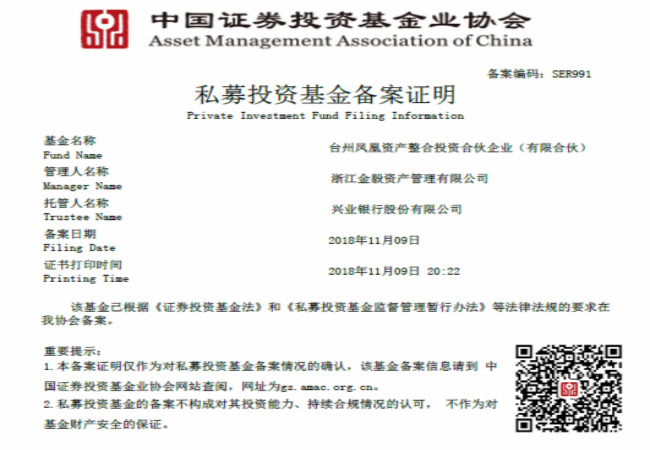 2018年11月9日,由浙商資產(chǎn)下屬金毅資產(chǎn)(私募基金管理人)發(fā)起設(shè)立的有限合伙型私募投資基金——臺(tái)州鳳凰資產(chǎn)整合投資合伙企業(yè)基金(有限合伙)(備案編碼:SER991)順利通過中國(guó)證券投資基金業(yè)協(xié)會(huì)備案,標(biāo)志著該基金順利完成運(yùn)營(yíng)前所有審批工作,即將進(jìn)入正式運(yùn)行。