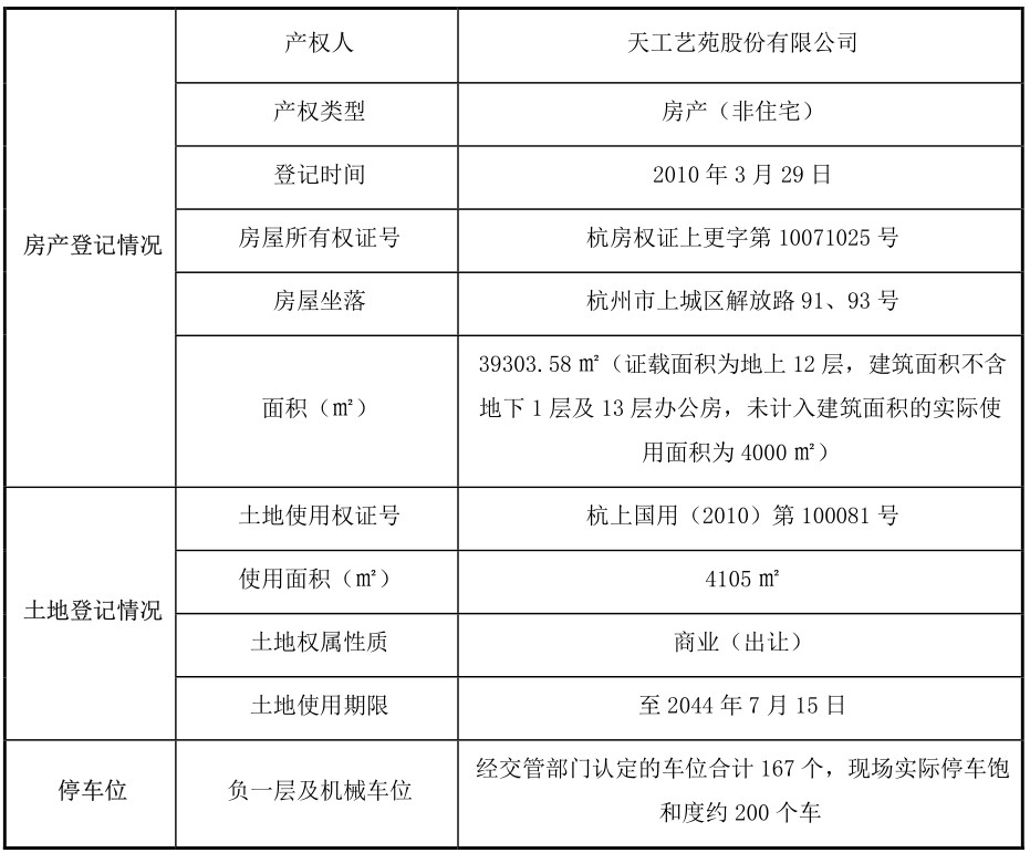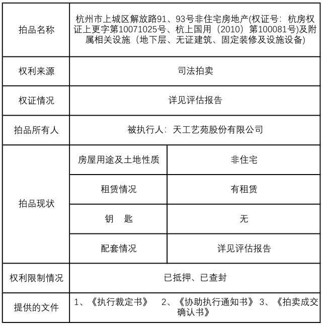 我司于2016年12月至2018年10月期間收購了工商銀行、上海浦東發(fā)展銀行、農(nóng)業(yè)銀行對天工藝苑股份有限公司的貸款債權(quán),該債權(quán)項下抵押物為天工藝苑股份有限公司名下位于杭州市解放路91、93號的天工藝苑大樓。根據(jù)浙江省高級人民法院集中管轄指示,杭州市下城區(qū)人民法院對天工藝苑大樓開展執(zhí)行拍賣。