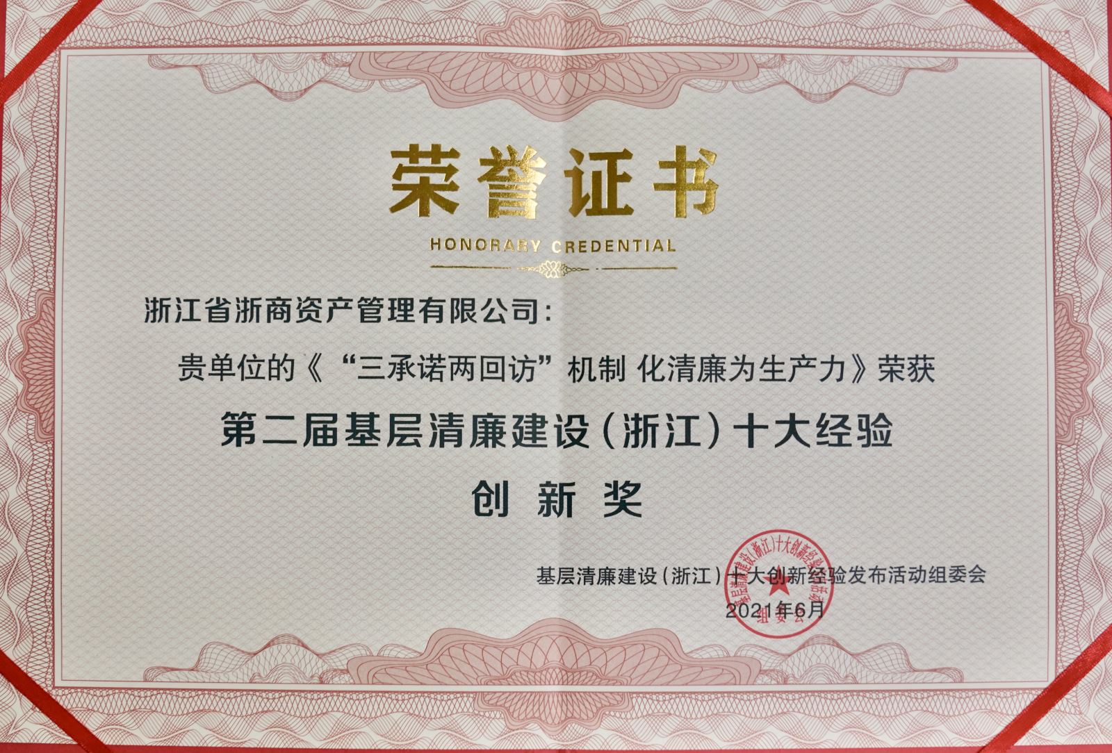 6月18日,由省紀(jì)委省監(jiān)委指導(dǎo),浙江日報(bào)報(bào)業(yè)集團(tuán)、浙江大學(xué)主辦,《反腐敗導(dǎo)刊》雜志社、浙江大學(xué)廉政研究中心承辦的第二屆“基層清廉建設(shè)(浙江)十大經(jīng)驗(yàn)”發(fā)布活動(dòng)在杭州隆重舉行,浙商資產(chǎn)《“三承諾兩回訪”機(jī)制 化清廉為生產(chǎn)力》榮獲“創(chuàng)新獎(jiǎng)”。