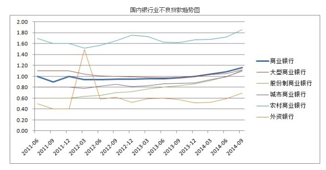 2014年三季度末,商業(yè)銀行不良貸款余額7669億元,較上季末增加725億元;商業(yè)銀行不良貸款率1.16%,較上季末上升0.08個百分點,顯示國內(nèi)銀行業(yè)的不良資產(chǎn)在快速增加。