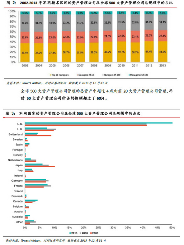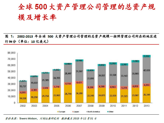 1.關(guān)于全球500 大資產(chǎn)管理公司:1)截至2013 年年底,全球500 大產(chǎn)管理公司管理的總資產(chǎn)規(guī)模達(dá)到76.5萬億美元,同比增長12.0%,首超過危機之前的2007 年的水平;2)其中北美地區(qū)的資產(chǎn)管理公司的規(guī)模是42 萬億美元,同比增長17.0%;歐洲為26.3 萬億美元,同比長9.8;日本為4.6 萬億美元,同比減少5.5%;3)超過6 成的資產(chǎn)由全球前500大資產(chǎn)管理公司管理。