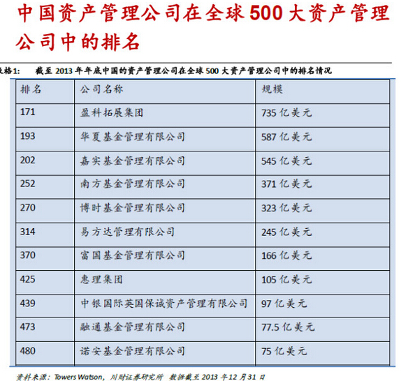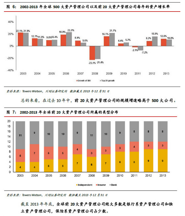 3.其它:1)截至2013 年年底,全球前20 大資產(chǎn)管理公司中有12 家自美國,8 家來自歐洲;絕大多數(shù)是銀行系和獨立資產(chǎn)管理公司,保險資產(chǎn)管理公司占少數(shù);2)中國大陸的資產(chǎn)管理公司只有華夏基金管理有限公司一家勉強進(jìn)入前200 名,而巴西卻有4 家資產(chǎn)管理公司排在前100名以內(nèi),中國的資產(chǎn)管理行業(yè)潛力巨大且任重道遠(yuǎn)。