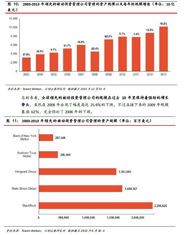2.關(guān)于領(lǐng)先的被動投資資產(chǎn)管理公司:2003 年以來,領(lǐng)先的被動投資產(chǎn)產(chǎn)管理公司的規(guī)模增長迅速,年均復(fù)合增長率達(dá)到12.4%,而全球500大資產(chǎn)管理公司只有5.8%。